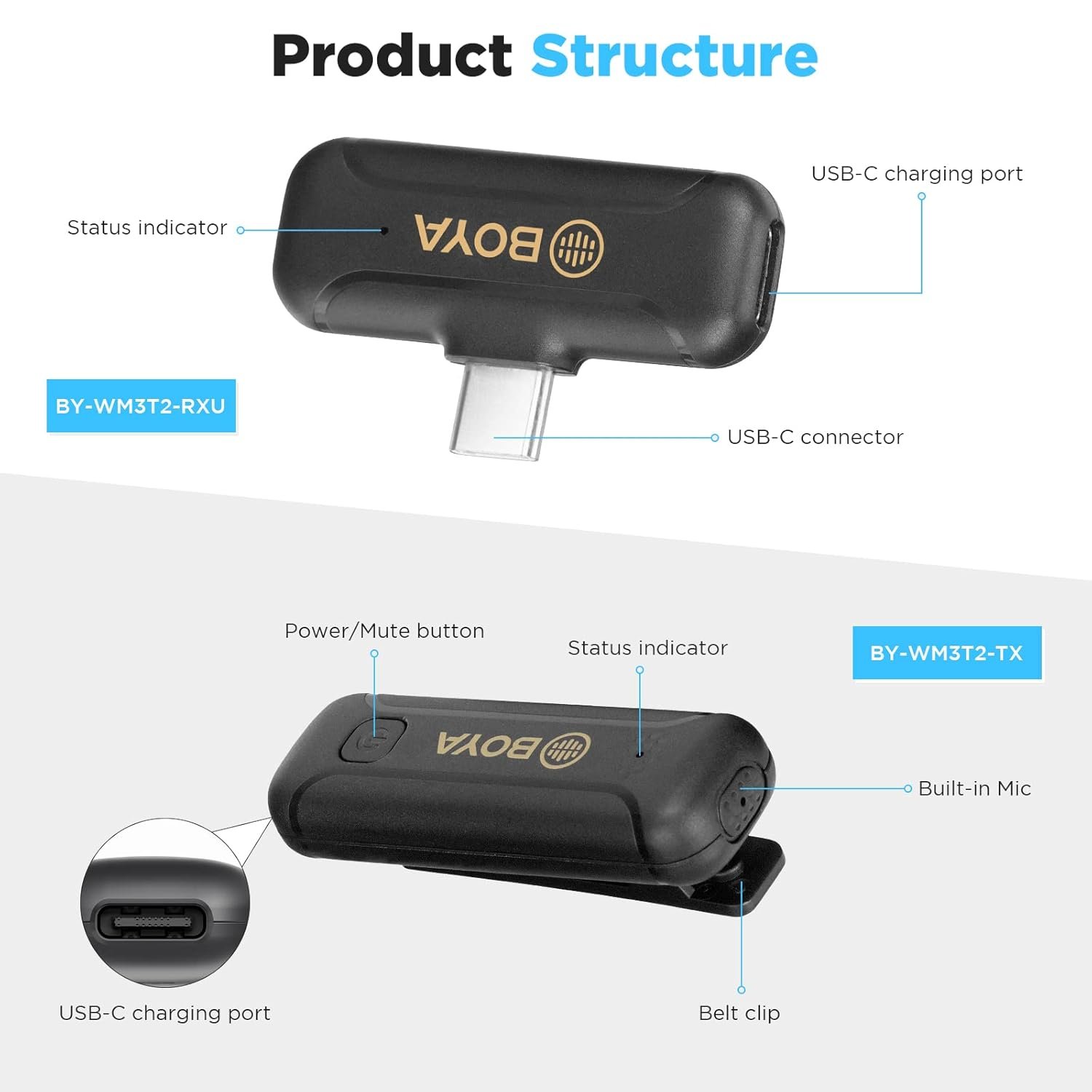 • 【Full Compatibility: 】 :The upgraded wireless clip-on microphone BY-WM3T2-U2 is equipped with a USB-C connector receiver, a built-in microphone transmitter, and a charging Cable. Compatible with USB C smartphones, tablet, laptop etc, suitable for interviewing, online conferencing, podcasting, vlogging, live streaming.