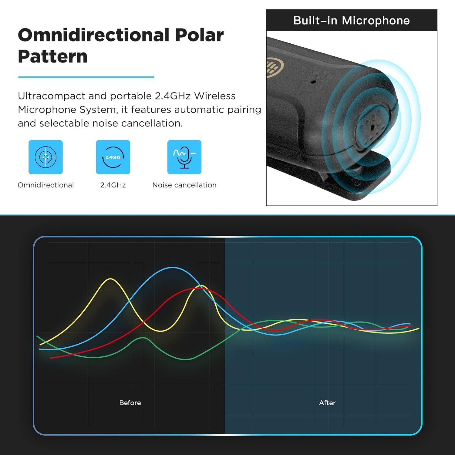 • 【Selectable Noise Cancellation】: The BY-WM3T Wireless Microphone is with MUTE and NOISE CANCELLATION. Long press the Power button to turn on/off the unit; Short press the Power button to mute/unmute the microphone; Double click the Power button to turn on/off noise cancellation.