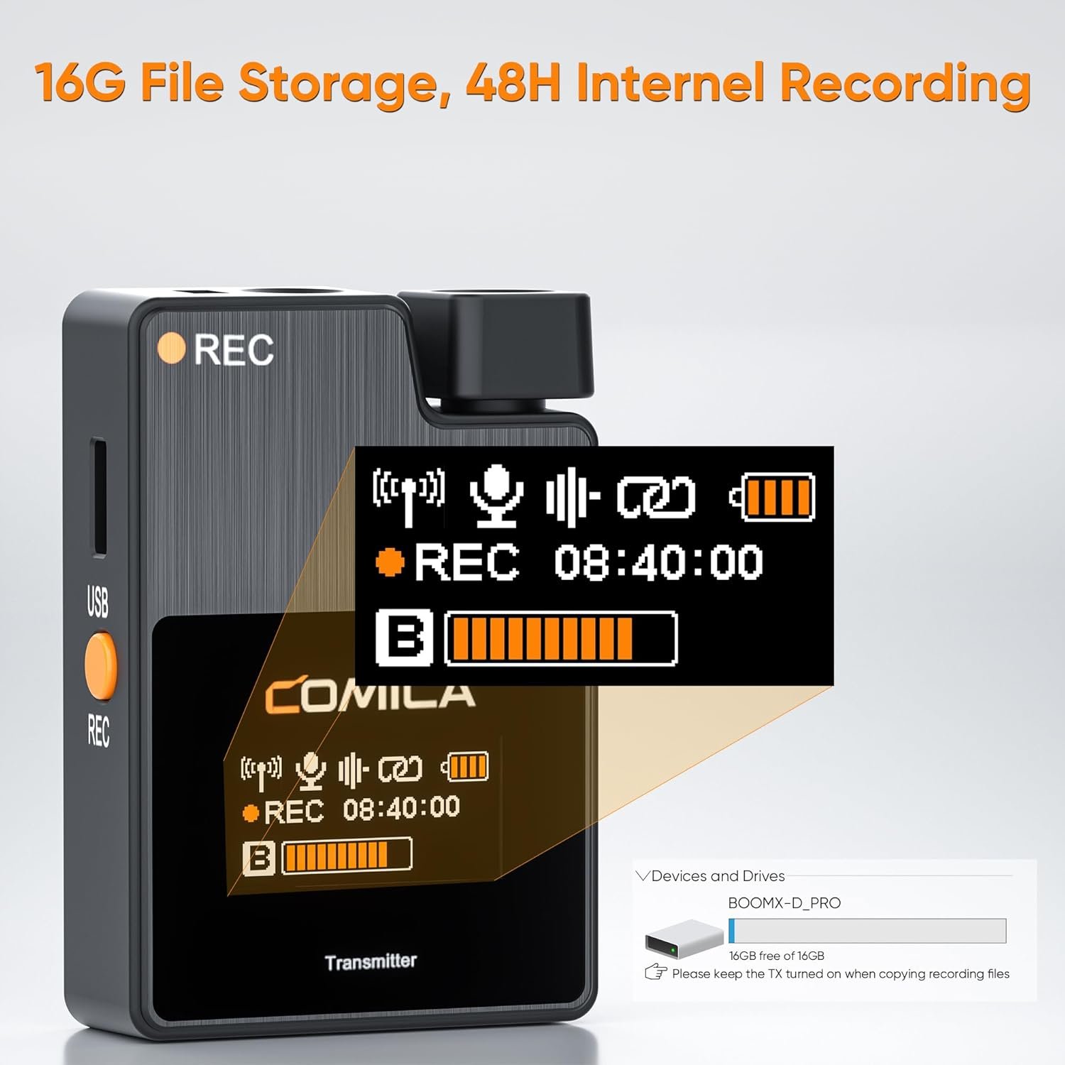 - 【8G Memory, No SD Card Required】The microphone comes with 8G internal memory for use. During continuous recording, a new recording file will be saved every 2 hours of recording, and the total recording time is 24 hours. You can only use the orange cable of the attached 3-1 cable to copy recording files. Please keep TX turned on when copying recording files.