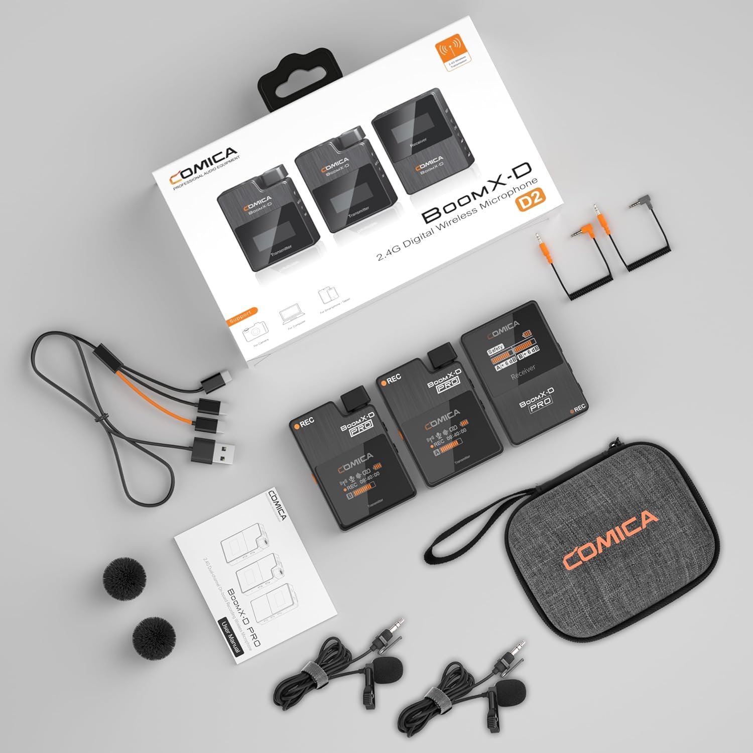 - 【BoomX-D2 Upgrade Microphone Kit】BoomX-D PRO 2.4G dual-channel onboard recording wireless microphone is a new upgraded microphone. It has all the features of BoomX-D, automatic frequency modulation, screen display, volume adjustment, Low Latency < 20ms, mono/stereo output, support for real-time monitoring, internal and externalmic, multi-function back clip, etc.