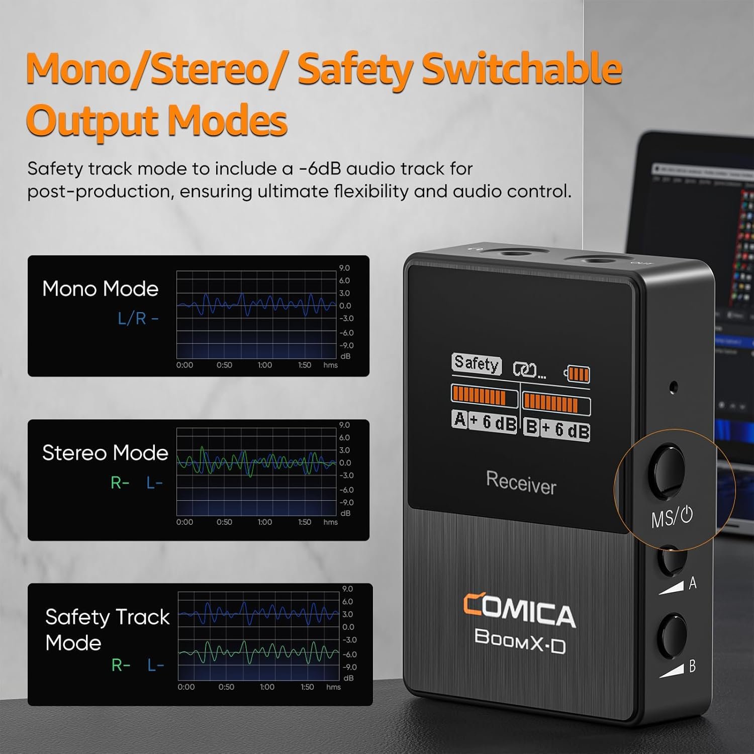【2.4G Digital RF technology wireless mic】Comica BoomX-D2 is designed for reliable and trouble-free performance.Working distance up to 50ft and our frequencies has no conflict with the govt frequencies for safe usage.