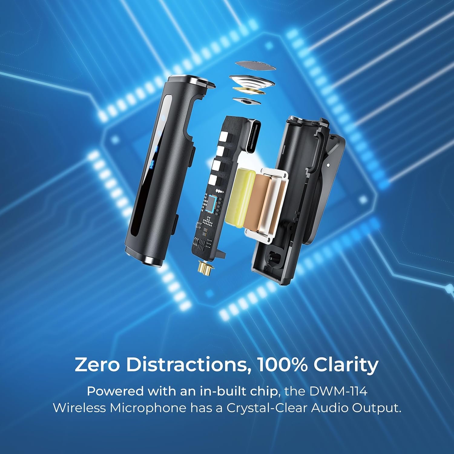 - DIGITEK WIRELESS MICROPHONE SYSTEM: The Digitek DWM-114 is a cutting-edge 2-in-1 wireless microphone that combines high-quality sound recording with the convenience of wireless technology. Ideal for professionals and content creators, it provides excellent sound clarity in various recording scenarios, including vlogging, interviews, and video production.