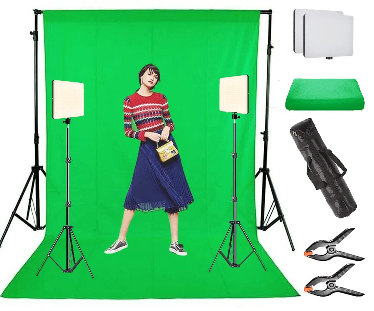 Snapshot: A comprehensive kit that includes a green-screen backdrop, adjustable stand system, and two camera LED lights — tailored for YouTubers, streamers, and creators in home studios.