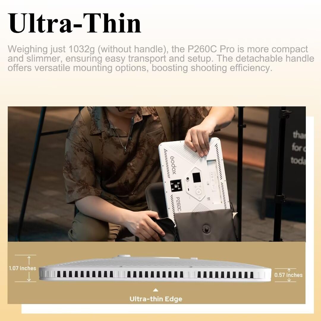 【Ultra-Thin Design】Weighing just 1032g (without handle), the P260C Pro is more compact and slimmer, ensuring easy transport and setup. The detachable handle offers versatile mounting options, boosting shooting efficiency.