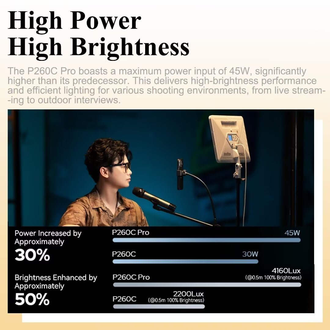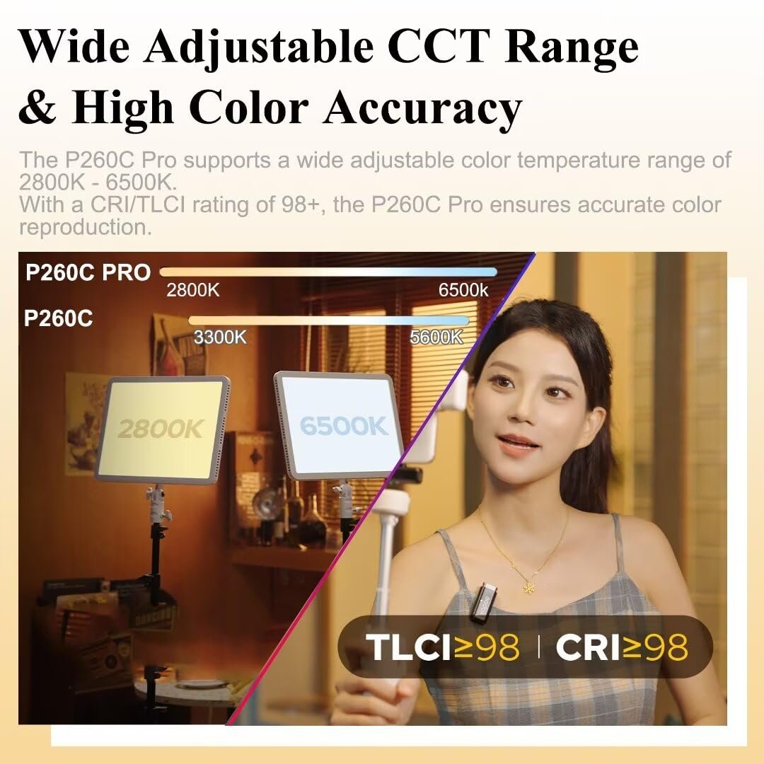 【High Power, High Brightness】The P260C Pro supports a wide adjustable color temperature range of 2800K – 6500K, boasts a maximum power input of 45W, significantly higher than its predecessor. This delivers high-brightness performance and efficient lighting for various shooting environments, from live streaming to outdoor interviews.