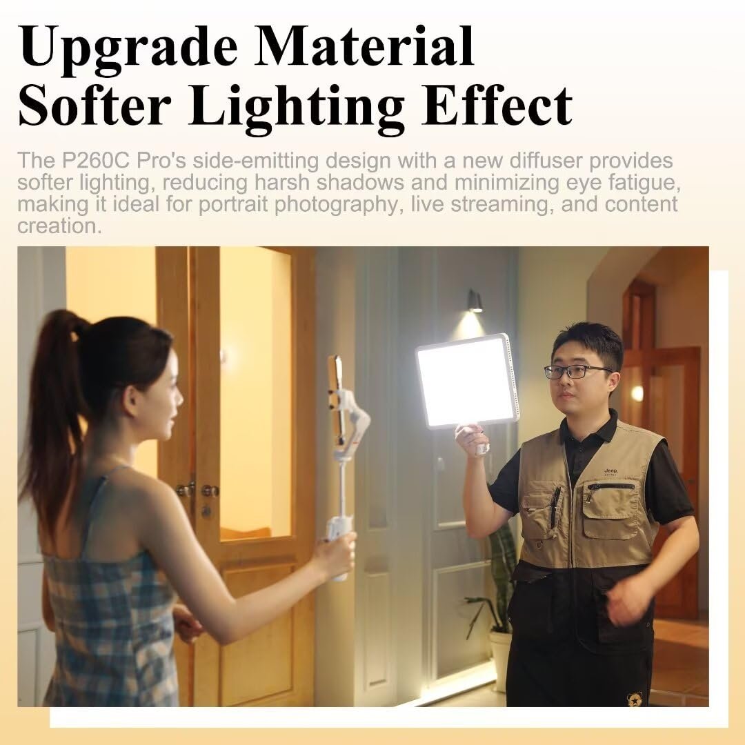 【Enhanced Diffuser for Softer Light】The P260C Pro’s side-emitting design with a new diffuser provides softer lighting, reducing harsh shadows and minimizing eye fatigue, making it ideal for portrait photography, live streaming, and content creation.