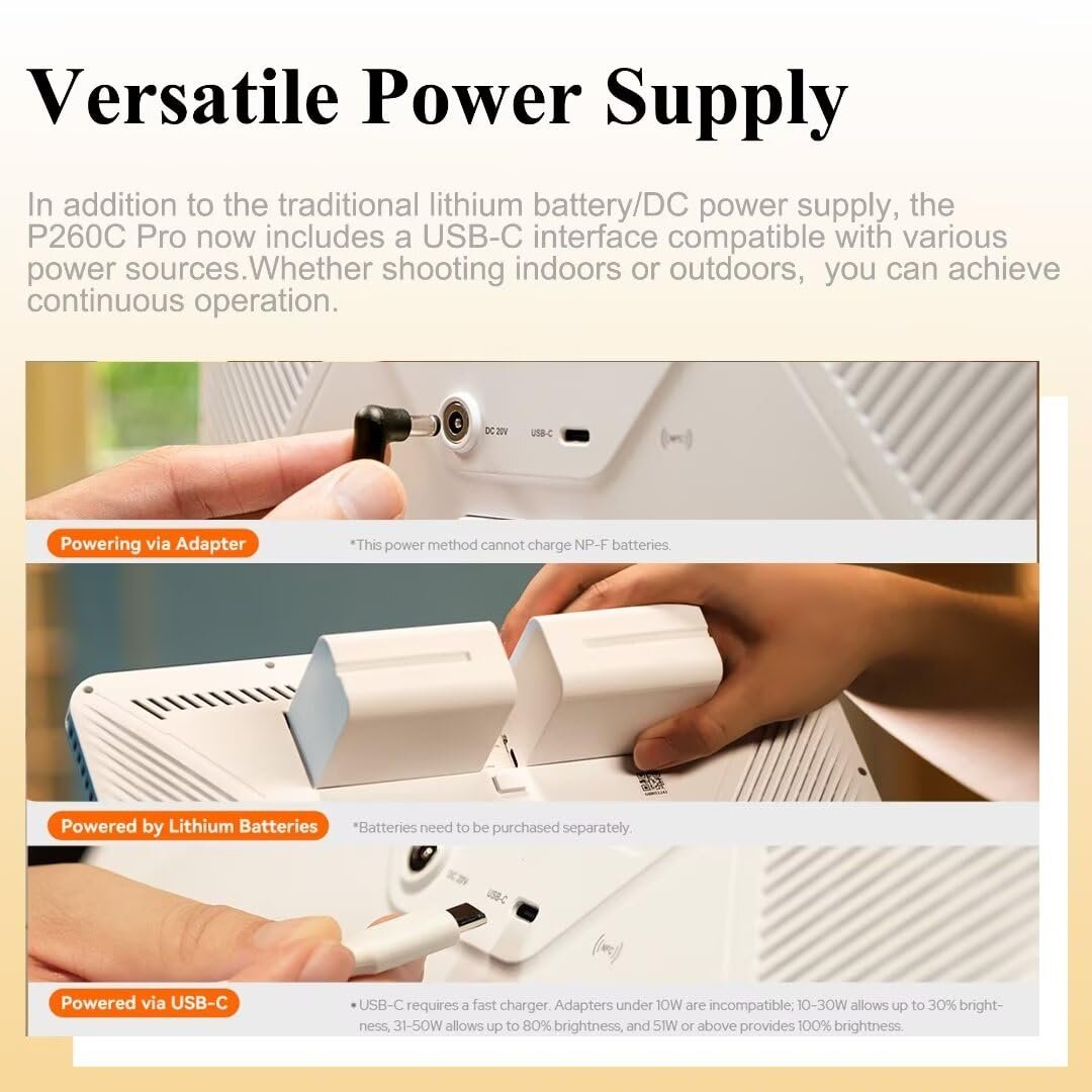 【Versatile Power Supply】In addition to the traditional lithium battery/DC power supply, the P260C Pro now includes a USB-C interface compatible with various power sources.Whether shooting indoors or outdoors, you can achieve continuous operation.