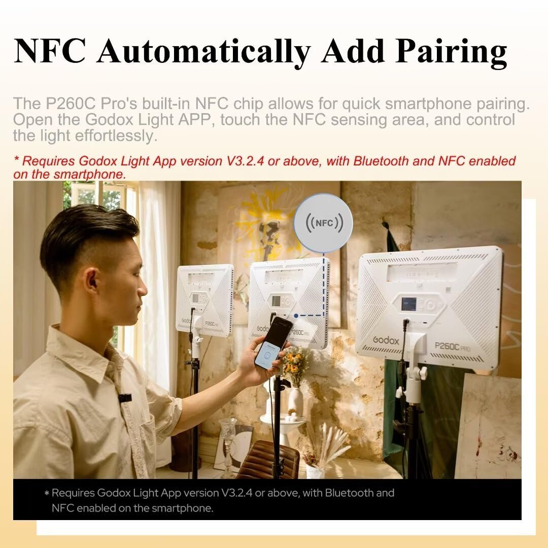 【NFC Automatic Pairing】The P260C Pro’s built-in NFC chip allows for quick smartphone pairing. Open the Godox Light APP, touch the NFC sensing area, and control the light effortlessly.