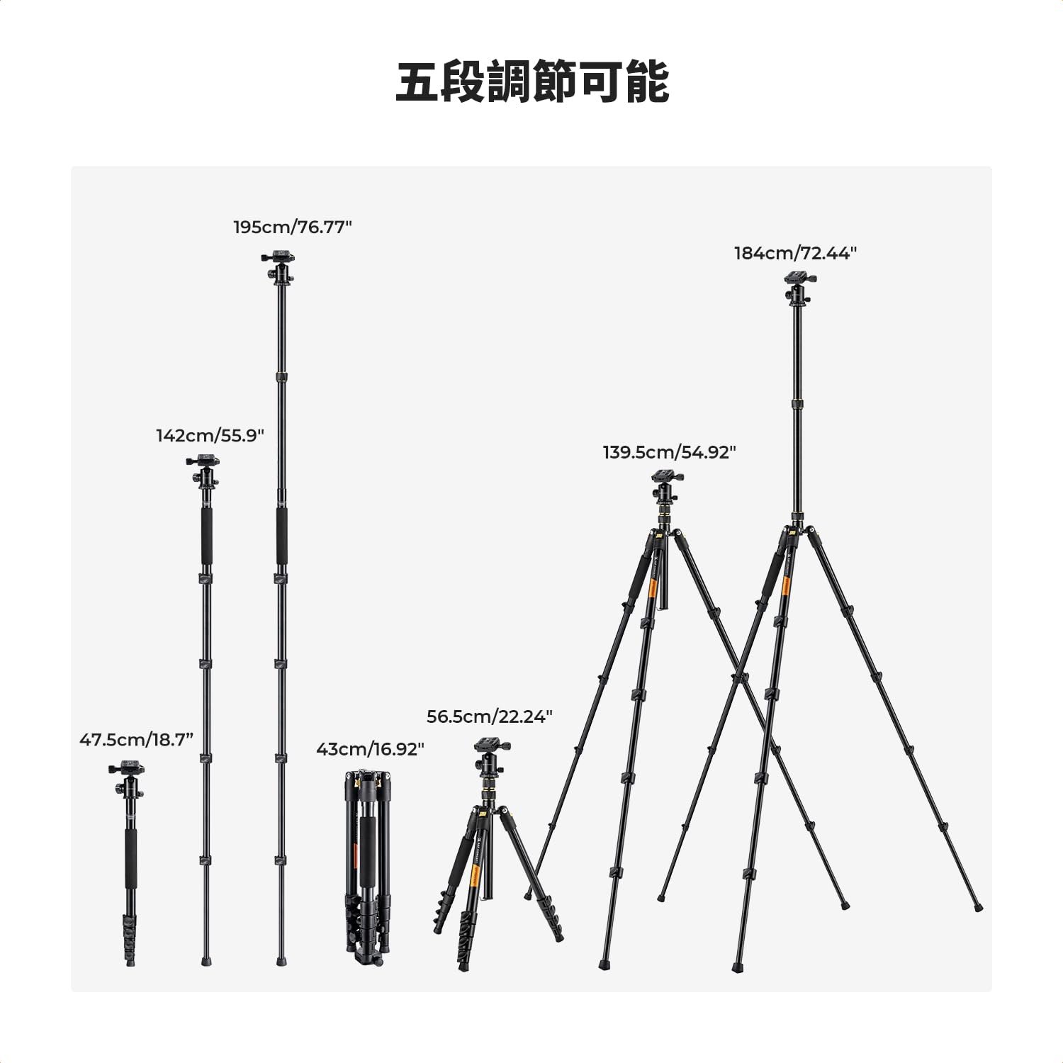 - The tripod combines practical and portability factors,with the maximum height (without center column) of the most stability is 52.4” (1330mm),providing sufficient stability and shooting height as far as possible; The max height is 62” (1560mm),making standing shooting easier and the min height is 16.1” (410mm) to meet various shooting environment and photographic needs.